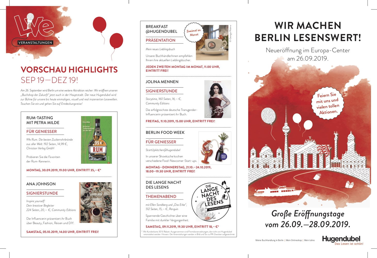 Hugendubel, eines der größten inhabergeführten Buchhandelsunternehmen Deutschlands, freut sich sehr, morgen, am 26. September 2019, die 1.100 qm große Filiale in der Tauentzienstraße 9-12 im Europa-Center zu eröffnen und damit erstmals auch in Berlin seinen Buchshop der Zukunft zu präsentieren. Das neue Konzept wird seit Ende vergangenen Jahres bereits in München mit großem Erfolg umgesetzt. Nun können sich auch die Berliner freuen. Hugendubel lädt in den komenden Tagen bis einschließlich Samstag zu vielen Aktionen ein, siehe Eröffnungsflyer anbei.